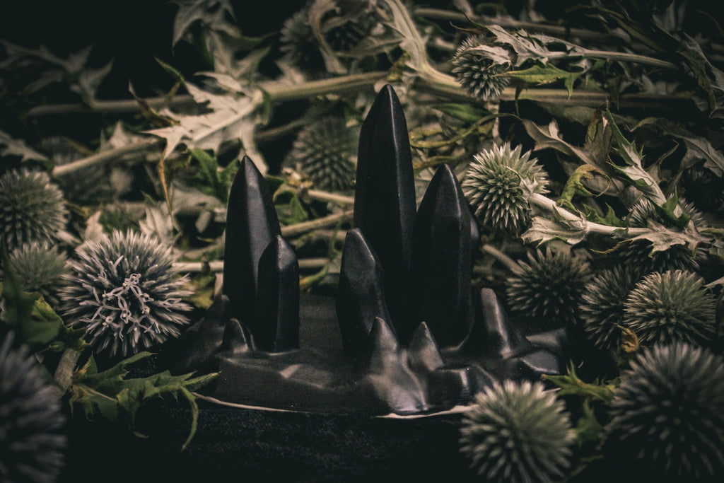 Styled and photographed by Malyon, the Stalagmite holders are covered in the beautiful hand crafted creations made by Ami of Brimstone Jewellery.
