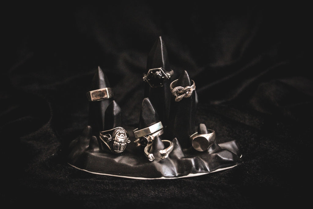Rings can be placed on the organic stalagmite formations of varied heights and sizes. The ceramic functional sculpture holds, protects and display your rings, and can also be used to store bracelets, earrings, photos, spells and other small treasures.