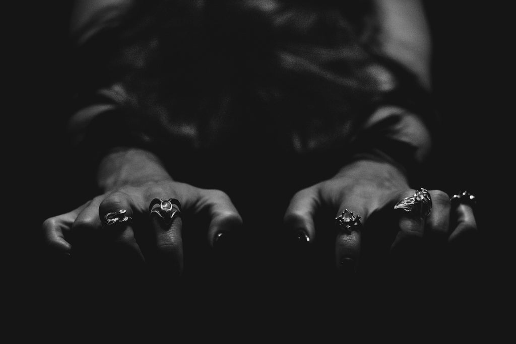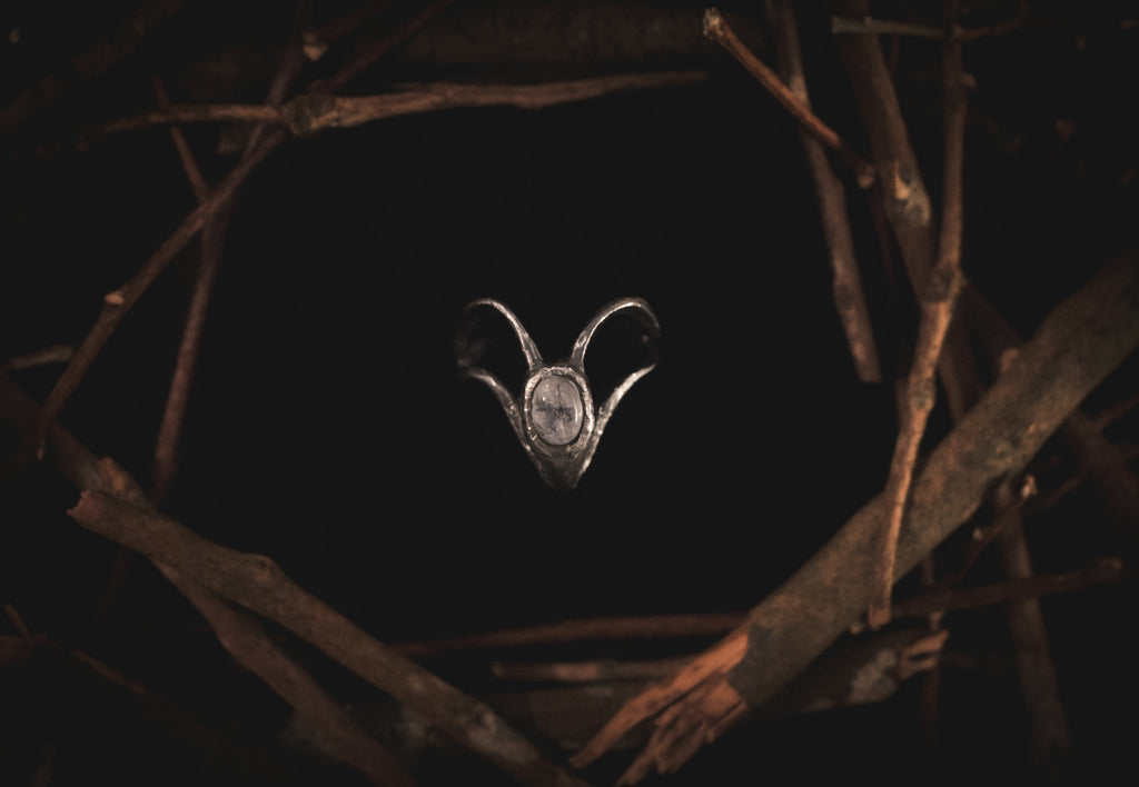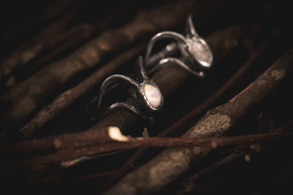 The moonstone is carefully hand set into the centre of the ring using a hammering technique to set, and the ring is finished with a gloomy grey hand hammered finish.