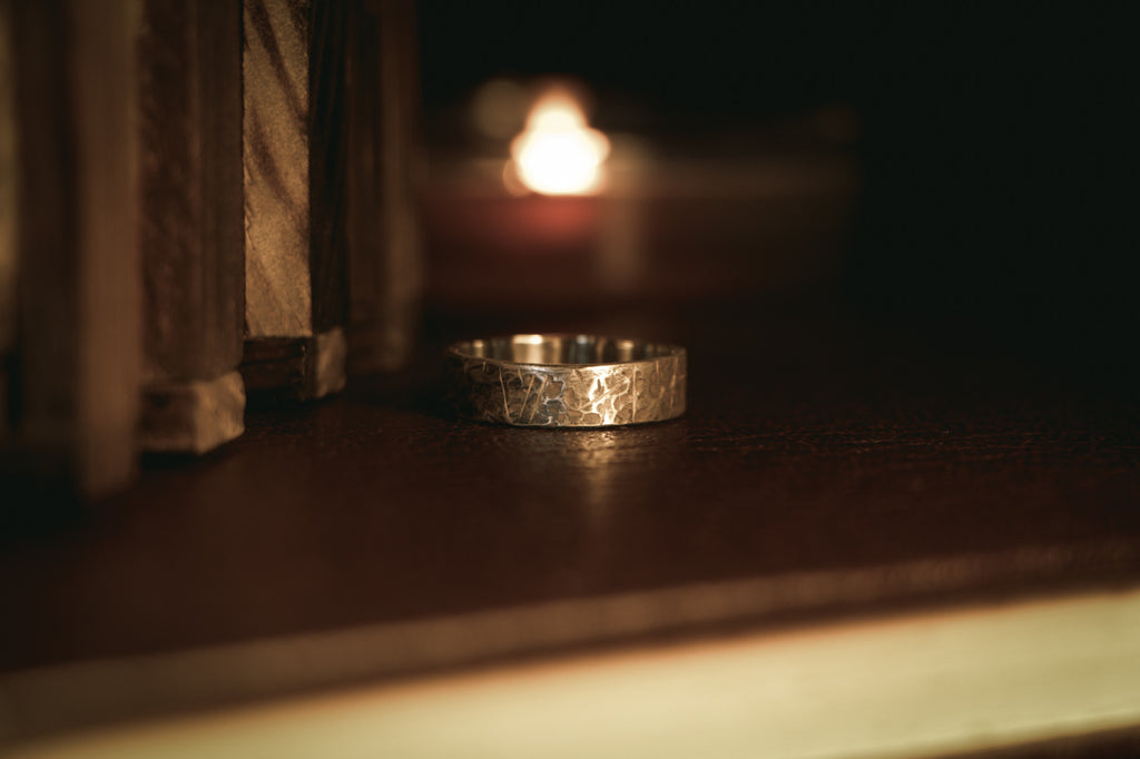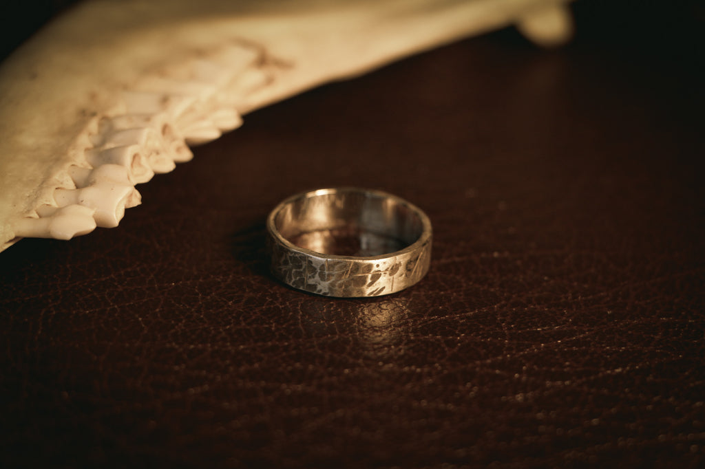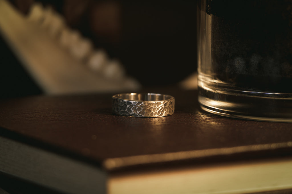 A 5mm width x 1mm thick solid band in Dark Gnosis finish - hand hammered and oxidised to a gloomy grey to create a weathered and individual dark look.