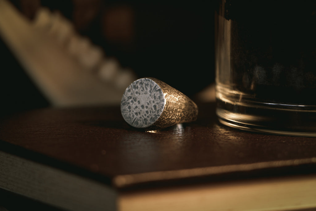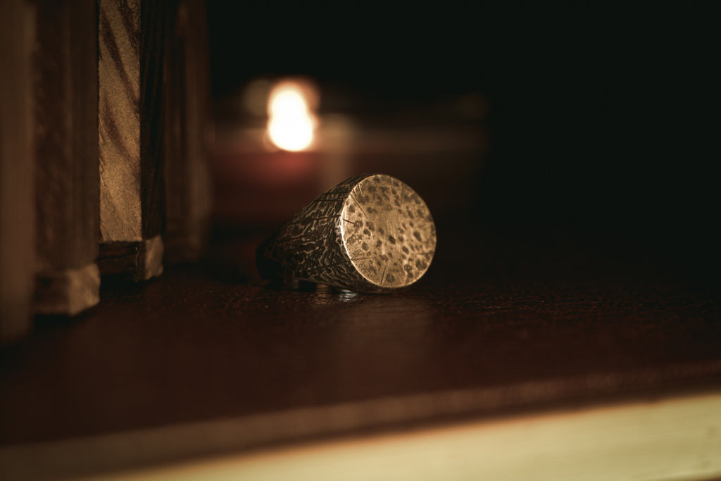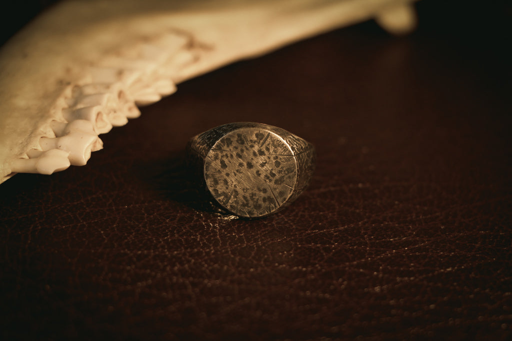 A 16mm diameter round signet ring in Dark Gnosis finish - hand hammered and oxidised to a gloomy grey to create a weathered and individual dark look.