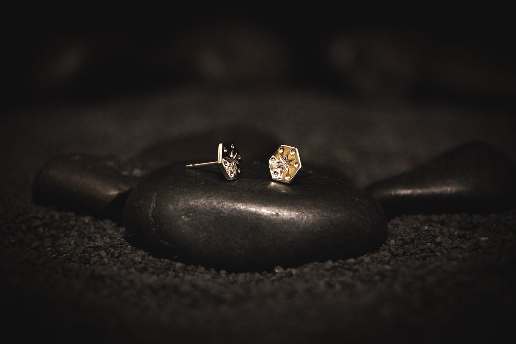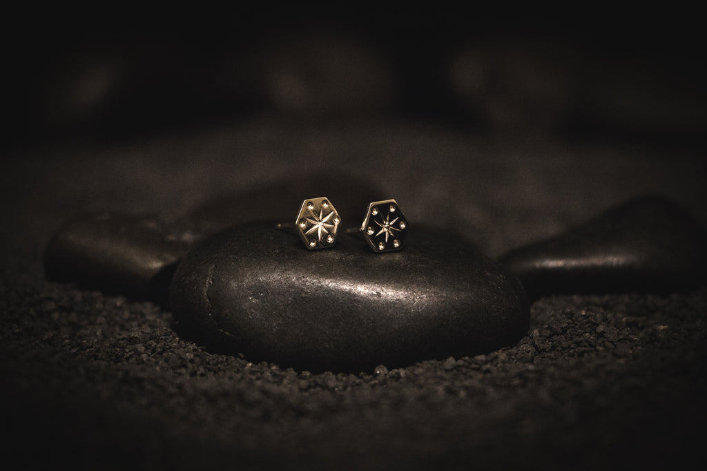 These small hexagon earrings measure 7x7mm. Each earring is hand engraved with a morning star and is available in solid silver, or 9ct yellow, red or white gold.