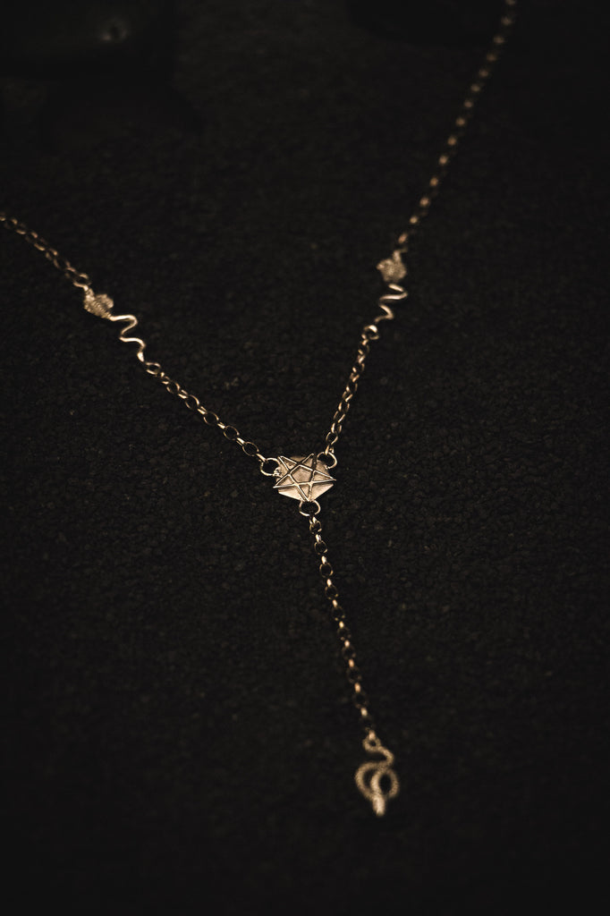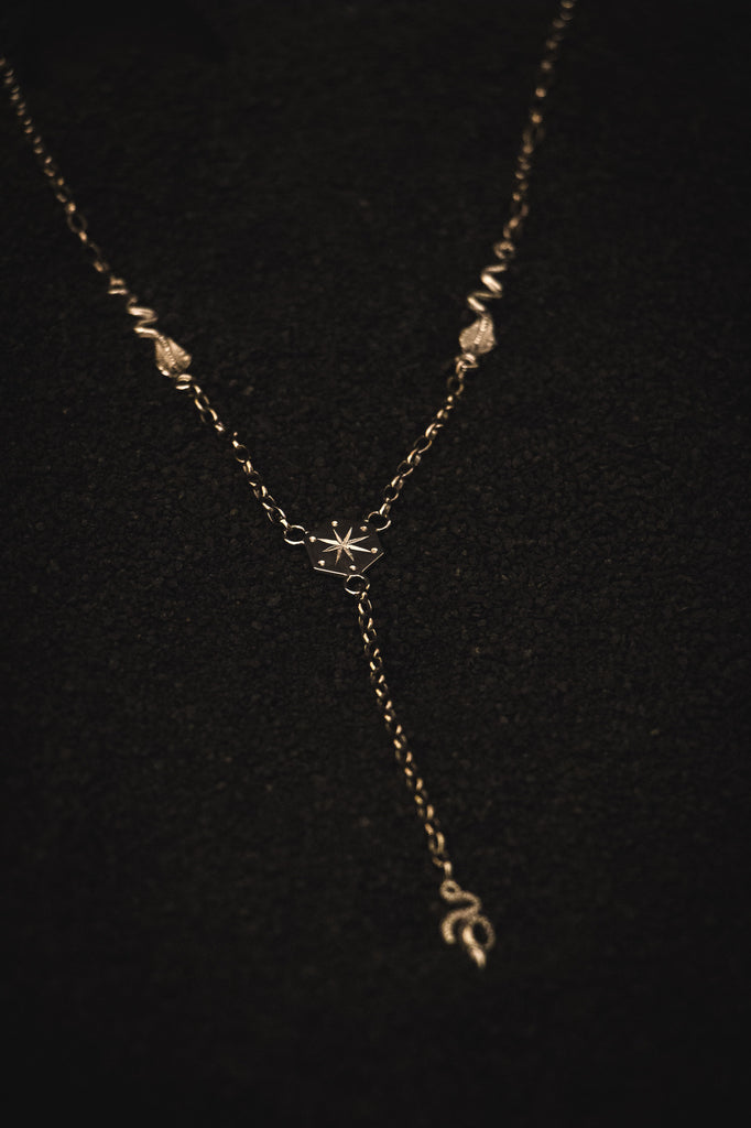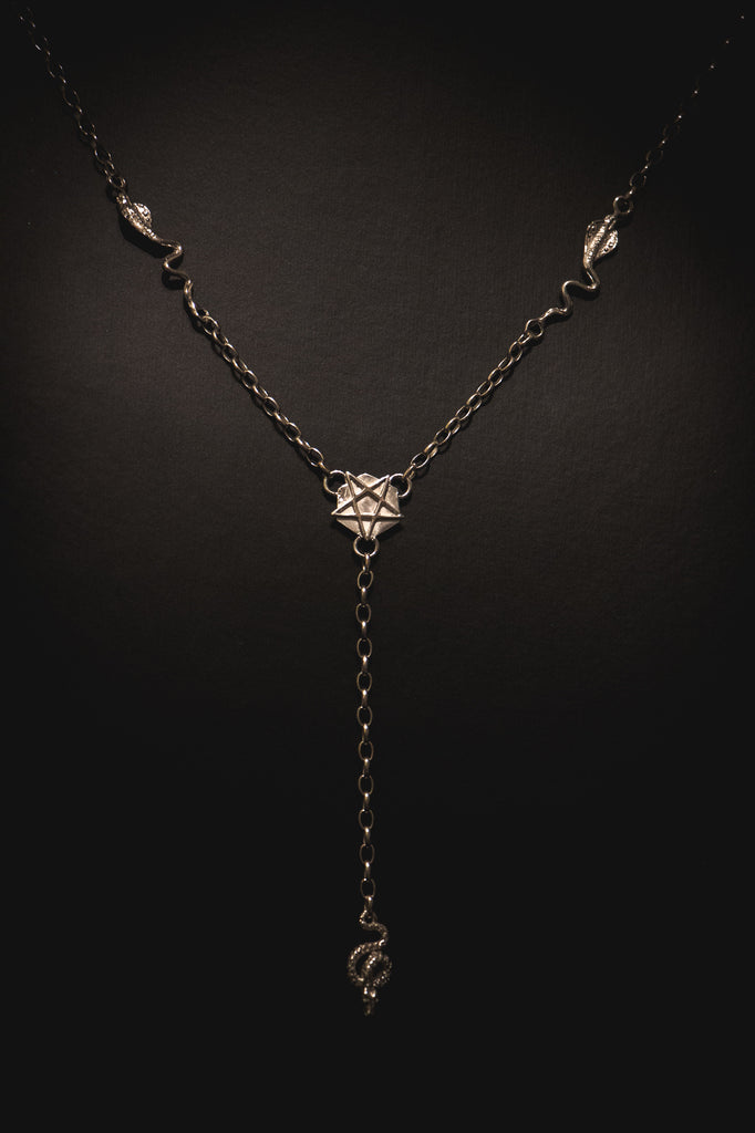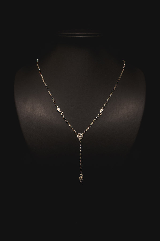 The hero of Brimstone Jewellery's 'Serpentine Hex' collection, this serpent lariat necklaces comprises a 60cm back clasped oval link solid chain, with an additional 10cm length to adorn the rosary serpent.