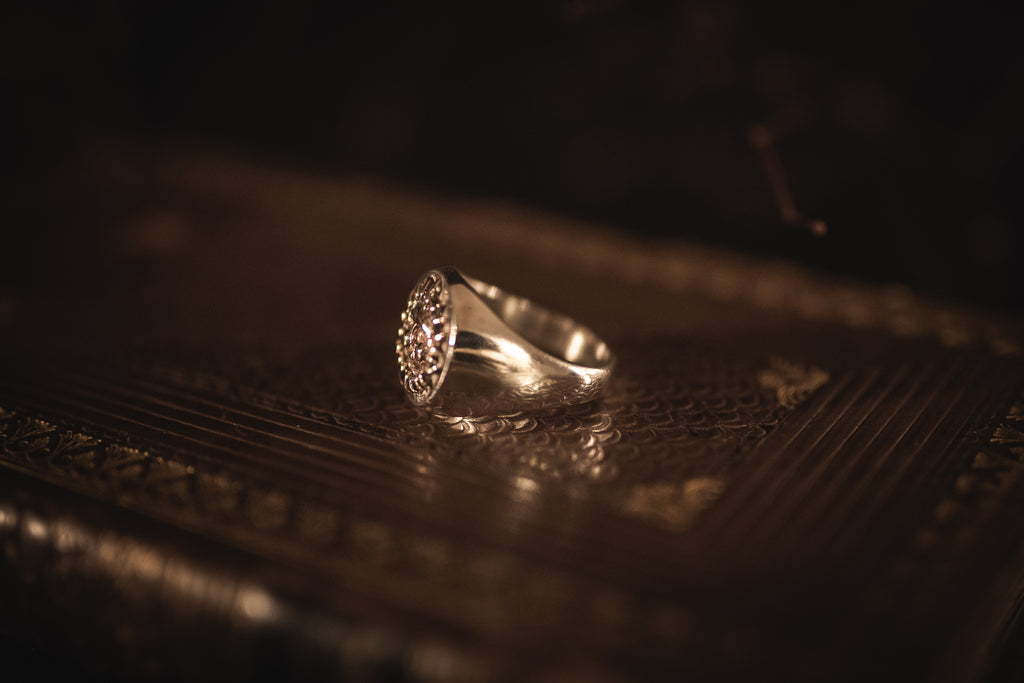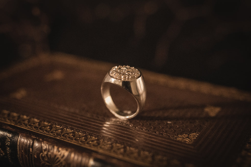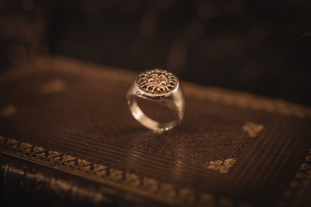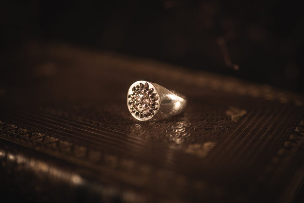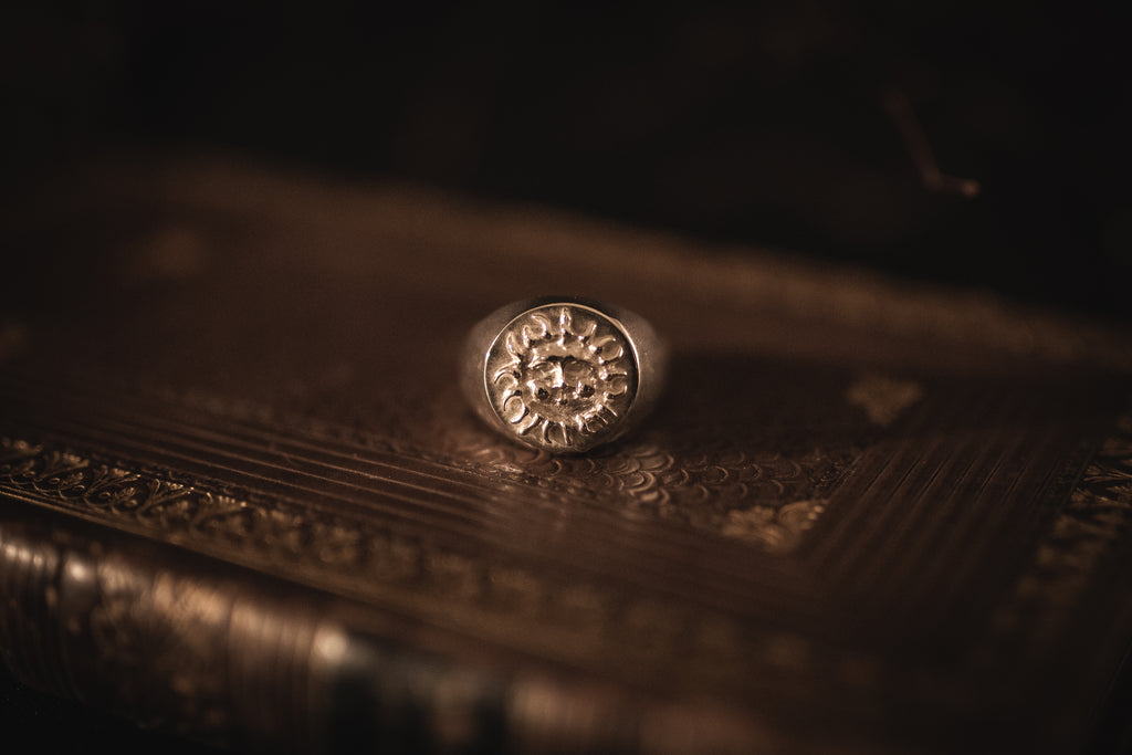 A bright glowing gold sun, atop a solid silver signet. This signet face measures a 16mm diameter.