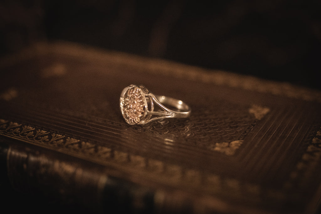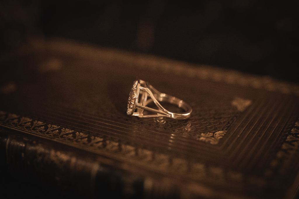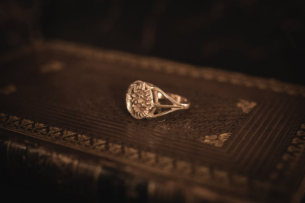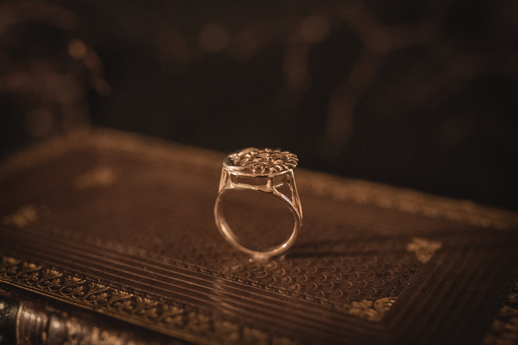 Old Sol & Luna adorn the top of this unique and elegant cage signet style ring.